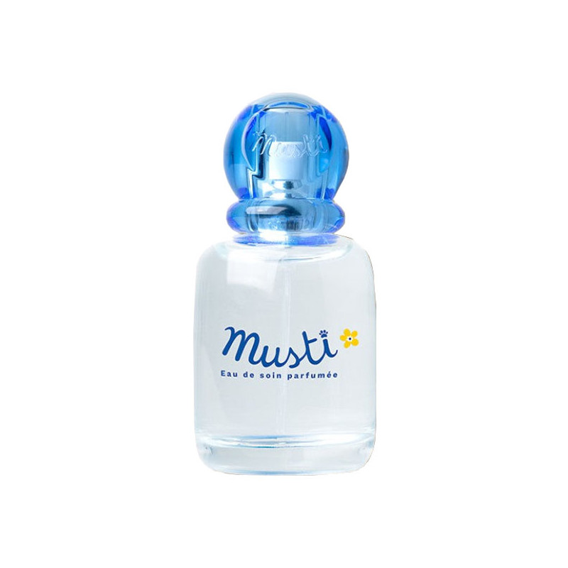 Musti Eau de soin perfuma delicadamente a bebés y niños, aportándoles un toque de frescor y ternura con sus sutiles notas de cítricos, rosa y lila. Puede utilizarse con total seguridad desde el nacimiento*.