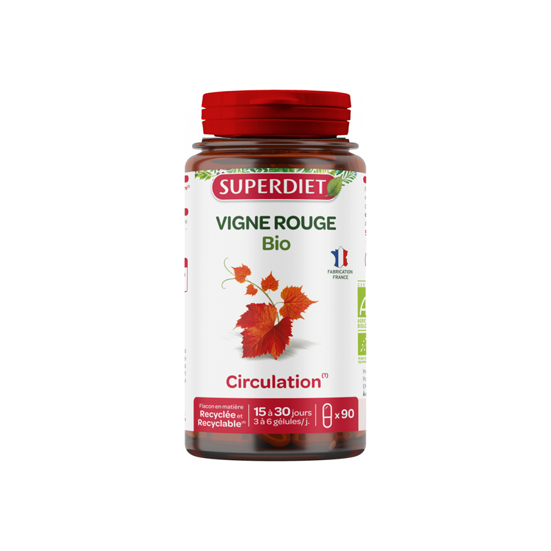 La Vid Roja es reconocida por sus numerosas propiedades beneficiosas para la circulación sanguínea, ayudando al buen funcionamiento del sistema venoso, lo que contribuye a aliviar la sensación de pesadez en las piernas.