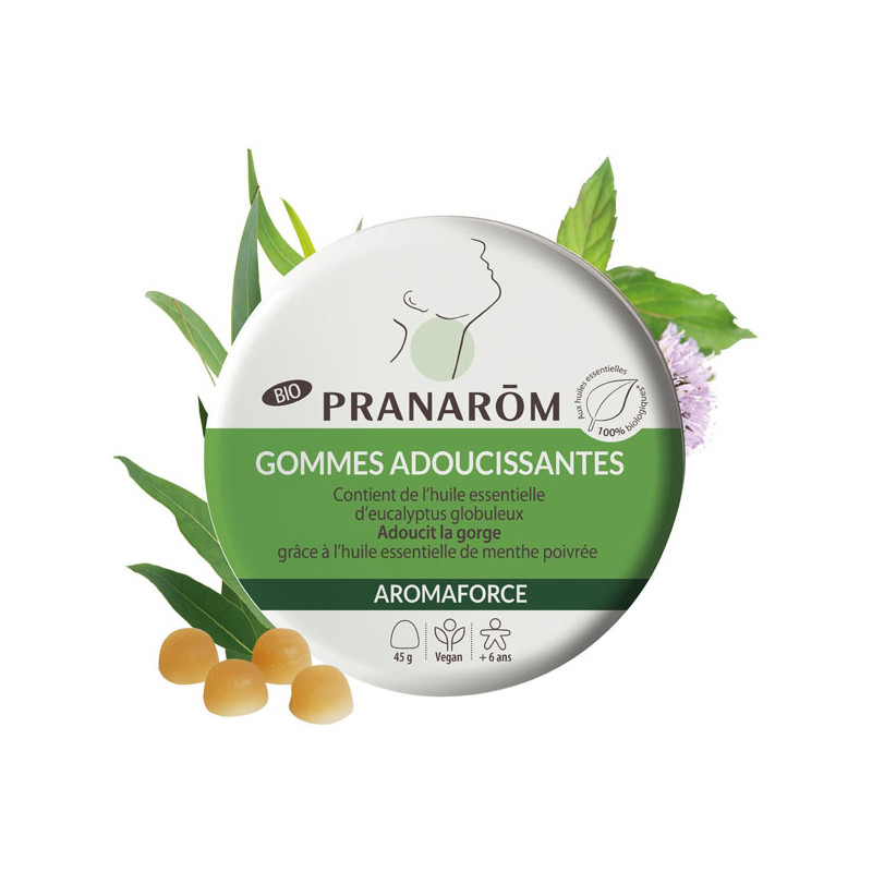 Los chicles calmantes Pranarôm aromaforce menta/eucalipto bio contienen aceite esencial de eucalipto globulus y aceite esencial de menta piperita para calmar la garganta. Estos chicles bio calman la garganta irritada y ronca en caso de resfriado, dolor de garganta o para purificar la cavidad bucal. Chicles dulces y de sabor fresco en una práctica caja metálica.