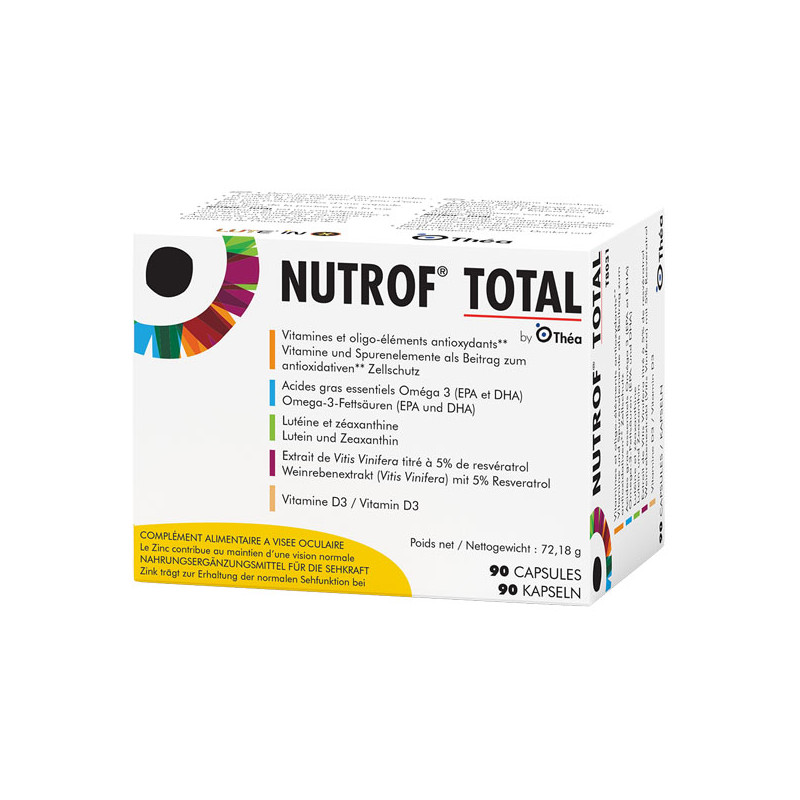 Huile de poisson (Acides gras essentiels Oméga 3 : DHA + EPA + DPA), Gélatine bovine, Eau purifiée, Humectant : Glycérol ; Vitamine C (Acide L-ascorbique), Vitamine C (Calcium ascorbate), Émulsifiant : Glycérol monostéarate ; Lutéine, Vitamine E (d alpha-tocophérol), Zinc (sulfate de zinc), Extrait de Vitis Vinifera (Resvératrol), Humectant : Sorbitol ; Zéaxanthine, Colorant : Oxyde de fer noir ; Cuivre (Sulfate de cuivre), Vitamine D3 (Cholécalciférol).