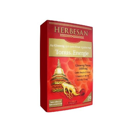 Herbesan Tonus et Energie 20 Ampollas es un complemento alimenticio a base de Panax ginseng, jalea real, Vitamina C y acerola, que ayuda a mantener el tono y la energía durante todo el día. Este complemento alimenticio contiene :