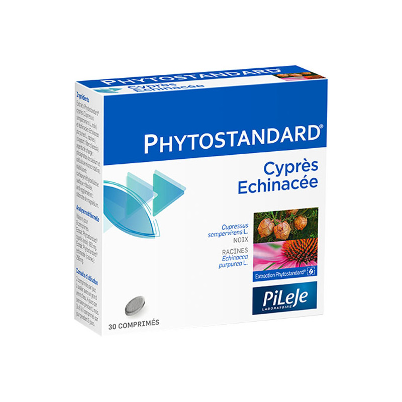 Extraits de cyprès (Cupressus sempervirens, noix) et d’échinacée (Echinacea Purpurea L., racine) (support : fibre d’acacia), agents de charge : carbonate de magnésium, phosphate dicalcique et croscarmellose sodique, amidon de maïs, anti-agglomérant : stéarate de magnésium.