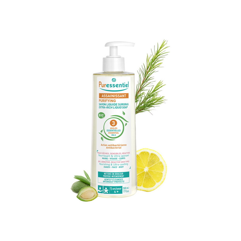 Este jabón líquido supergraso con 3 aceites esenciales BIO (Limón, Árbol del Té, Lavanda) tiene una acción antibacteriana y limpia con suavidad y eficacia. Nutritivo y ultrasuave, está indicado para pieles secas, sensibles y reactivas. Ideal para uso diario, repetido y frecuente en manos, rostro y cuerpo. Deja la piel sana y delicadamente perfumada. Respeta el equilibrio fisiológico de la piel. Tolerancia óptima.