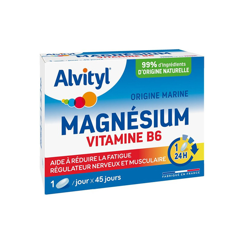 En sólo 1 comprimido al día, Alvityl Magnesio Vitamina B6 aporta la cantidad adecuada de magnesio (de origen marino) y vitamina B6 para ayudar a reducir la fatiga y contribuir a mantener una función psicológica normal.