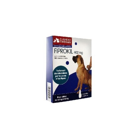 Clément Thékan Fiprokil 402 mg Très Grands Chiens 4 Pipettes trata las infestaciones por pulgas (Ctenocephalides spp.) y garrapatas (Dermacentor Reticulatus) en perros de entre 40 y 60 kg de peso. La eficacia insecticida del producto persiste hasta 8 semanas frente a pulgas (Ctenocephalides Felis), la eficacia acaricida del producto persiste hasta 4 semanas frente a garrapatas (Rhipicephalus Sanguineus, Ixodes Ricinus, Dermacentor Reticulatus). Si hay garrapatas de determinadas especies presentes cuando se aplica el producto (Rhipicephalus Sanguineus e Ixodes Ricinus), es posible que no mueran todas en 48 horas, pero sí en la primera semana. El producto puede incorporarse a un programa terapéutico para el tratamiento de la dermatitis por hipersensibilidad a la picadura de pulga (DHP) si así lo ha diagnosticado el veterinario.