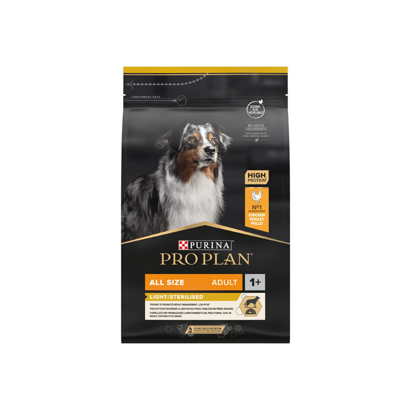 PURINA PRO PLAN All Sizes Adult Light / Sterilised Pollo con OPTIWEIGHT garantiza la satisfacción de las necesidades nutricionales de su perro.