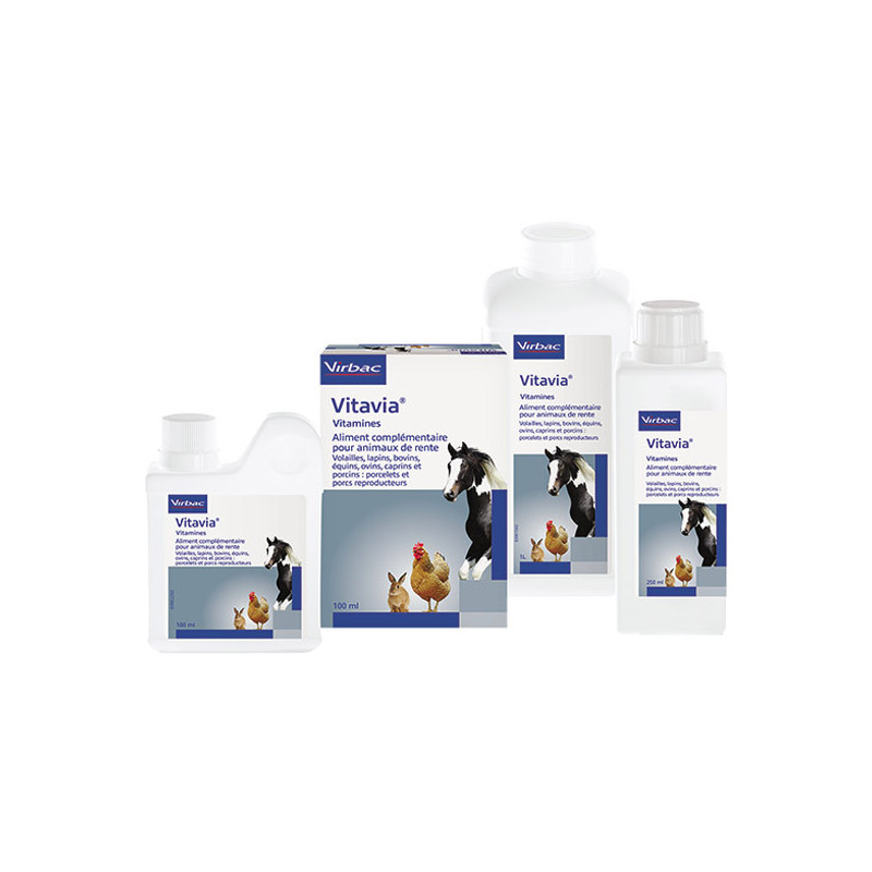 Vitavia es un complemento alimenticio hidrosoluble especialmente diseñado para aves de corral (gallinas ponedoras, pollitas, pollitos) y conejos. Consiste en una mezcla de vitaminas esenciales para complementar la dieta de estos animales. Enriquecido con vitaminas, Vitavia ayuda a reforzar las defensas inmunitarias, mejorar la calidad de los huevos y favorecer un crecimiento sano.