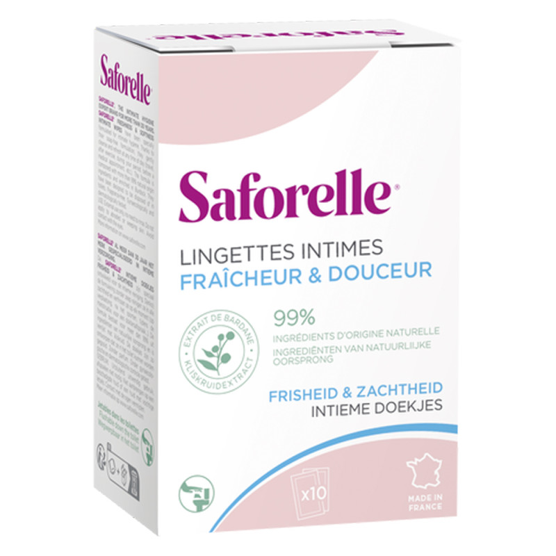 En movimiento, antes de una cita médica, durante la menstruación o después de hacer deporte, las Toallitas Íntimas Femeninas Saforelle limpian y refrescan suavemente la zona íntima en cualquier momento del día. Con una fórmula que contiene más de un 99,6% de ingredientes de origen natural y enriquecida con Bardana, las toallitas íntimas garantizan frescor y suavidad(2) estés donde estés. Fabricadas con un tejido 100% biodegradable y compostable(1), estas toallitas higiénicas pueden tirarse por el inodoro. Toallitas de higiene íntima probadas bajo control dermatológico y ginecológico(2). Excelente tolerancia general(2).