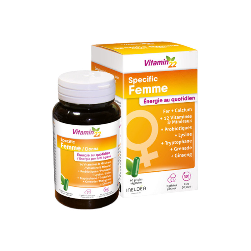 Combinación única de fermentos lácticos (2 mil millones de Vitaminas, Lactobacillus rhamnosus, Lactobacillus acidophilus), 8 Vitaminas (A, C, D, E, B6, B9, B12, K), 6 Minerales (Calcio, Magnesio, Hierro, Cromo, Manganeso y Boro), SPECIFIC Extractos vegetales (*Ginseng y Granada) y aminoácidos esenciales (Lisina y Triptófano), VITAMIN'22 FEMME ha sido especialmente formulado para aportar al organismo de la mujer los nutrientes esenciales que complementan juiciosamente su alimentación para favorecer su salud: