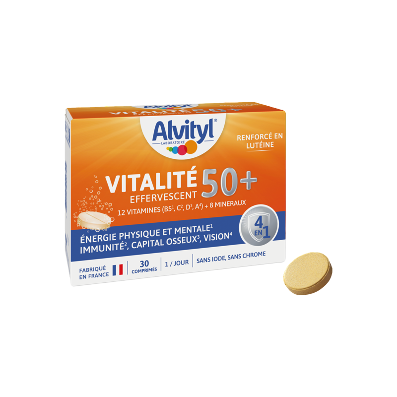 La fórmula de Alvityl Vitalité 50+ se ha desarrollado específicamente para responder a las necesidades de los mayores de 50 años: una dosis adaptada de vitaminas, minerales y plantas para aportar al organismo los recursos necesarios para recargar su vitalidad.